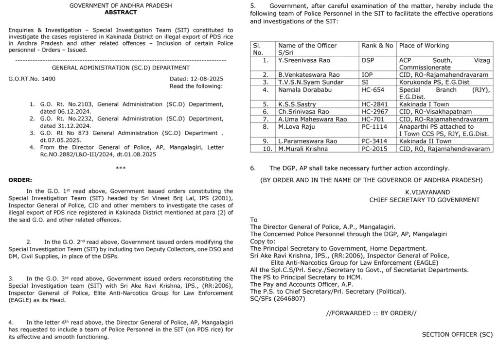తెలుసుకున్న వివరాల ప్రకారం, 2024 డిసెంబర్లో కాకినాడ జిల్లాలో PDS బియ్యం అక్రమ రవాణా, ఎగుమతులపై పలు కేసులు నమోదు అయ్యాయి. ఈ కేసులపై సమగ్ర విచారణ కోసం ఆ సమయానికే Vineet Brij Lal, IPS నాయకత్వంలో SIT ఏర్పాటు చేశారు. అయితే, దర్యాప్తు మధ్యలో మార్పులు చోటు చేసుకుని, 2025 మేలో ఈ SIT కి Ake Ravi Krishna, IPS (IG, EAGLE) ను అధిపతిగా నియమించారు.
