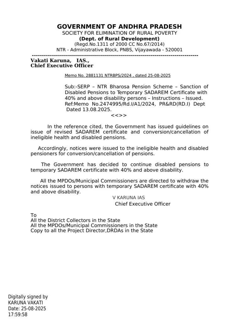 దీనితో, వారికీ యథావిధిగా పెన్షన్ కొనసాగనుంది. ఈ మేరకు జిల్లా అధికారులకు స్పష్టమైన ఆదేశాలు జారీ అయ్యాయి.